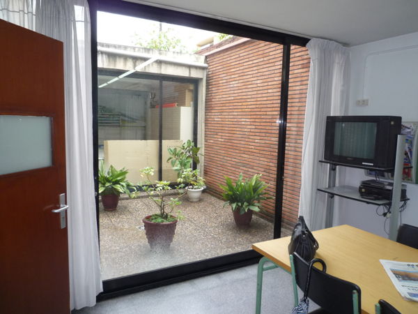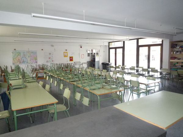 Desde el vestíbulo se accede a un cuerpo central que contiene el comedor y la cocina. Este elemento divide el patio central en dos zonas diferenciadas según las edades de los alumnos.